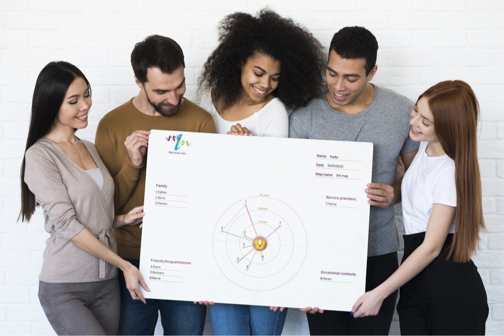 De MLM-Tool helpt cliënten om hun eigen sociale netwerk in kaart te brengen, vanuit hun perspectief. In één oogopslag wordt zichtbaar wie van betekenis is, waar steun zit, waar kwetsbaarheden zitten en wat nodig is voor passende ondersteuning.